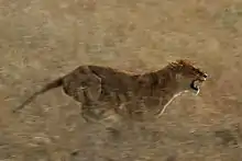 Львы — сильные животные, охотятся в скоординированных группах и преследуют выбранную жертву. Однако они менее выносливы, чем, например, гиены: у последних сердце составляет 1 % от всей массы тела, в то время как у львов от 0,45 % (у самцов) до 0,57 % (у самок)[66]. Таким образом, львы могут быстро бегать только на короткие дистанции[68] и во время атаки должны быть близко к своей добыче. Они пользуются факторами, которые помогают этого достичь, — в частности, охотятся ночью[69]. Львы подкрадываются к стаду копытных, пока расстояние не уменьшится до 30 метров или меньше. В большинстве случаев несколько львиц окружают его с разных сторон. Как только стадо оказывается в окружении, они набрасываются на ближайшее животное. Затем происходит быстрая и мощная атака. Хищники пытаются поймать свою жертву быстрым прыжком. Животное, как правило, погибает от странгуляции или удушья[70]. Мелкие животные могут быть убиты ударом лапы[2].