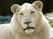 Белый лев — не отдельный подвид. Это специфический полиморфизм с генетическим заболеванием — лейкизмом[20], вызывающим более светлую окраску шерсти, чем у обычных львов. Такое проявление по сути противоположно меланизму, с которым связано появление чёрных пантер. Однако белые львы не альбиносы — у них нормальная пигментация глаз и кожи. Белые трансваальские львы иногда встречаются в национальном парке Крюгер и смежном с ним резервате Тимбавати в восточной части ЮАР. Однако чаще этот подвид можно встретить в неволе, где заводчики специально разводят этих животных. Необычный кремовый цвет шерсти обусловлен рецессивным геном[55]. По сообщениям некоторых авторов, белых львов разводили в Южной Африке для отстрела в качестве трофея[56].