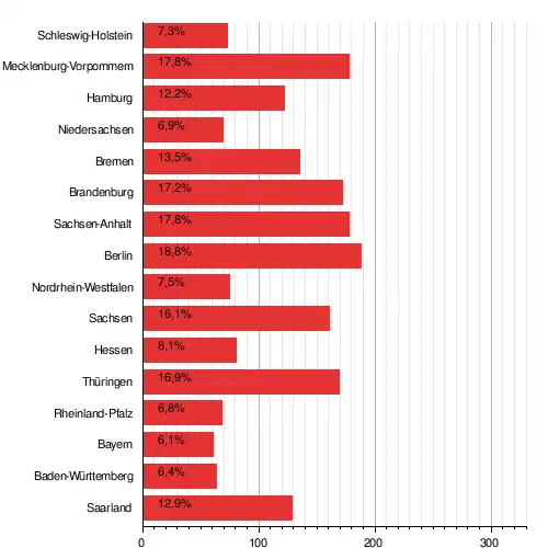 | Поддержка партии на федеральных выборах 2017 года по землям: пропорциональное голосование |
