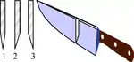 Кухонные ножи европейского стиля являются симметричными, в то время как японские кухонные ножи имеют усечённое асимметричное лезвие; модели для левшей редки, и обычно их необходимо специально заказывать[39].