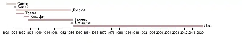 Джеки умер от инфаркта в 1935 году, но в заставке использовался вплоть до 1956 года (в 1953 году появилась заставка с Джеки в Cinemascope).[6]