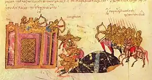 ![]() Нападение Торника на Константинополь. Мадридский Скилица. | |