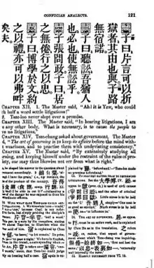 Первый том «Классиков» включал бо́льшую часть Четверокнижия: «Лунь юй», «Да сюэ» и «Чжун юн». Хотя на титульном листе значилось издательство Трюбнера в Лондоне, все работы были выполнены в типографии ЛМО в Гонконге. Типографский набор включал два комплекта китайских иероглифов (для основного текста и комментариев), а также многообразные латинские шрифты, в том числе курсивные, применяемые как в текстах, так и указателях. Второй том включал полный перевод трактата «Мэн-цзы». Тираж составил 1200 экземпляров. Отличительной особенностью издания Легга было использование им собственной системы транскрипции китайской фонетики. Это была система Моррисона — Медхёрста, доработанная Леггом для собственных нужд. Впрочем, в иероглифическом указателе к первому тому, он признавал достоинство системы консула в Пекине Уэйда, основанной на северном диалекте. Примечательно, что Легг неправильно указал число тонов ни для кантонского, ни для пекинского диалектов[103].