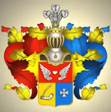 Щит разделён на три части, из коих в верхней красном поле между двух орлиных серебряных крыльев находится того же металла сердце; в нижней части в золотом поле находятся в правой стороне в латы облечённая рука с поднятым вверх мечом, а с левой в голубом поле четырёхконечный крест.