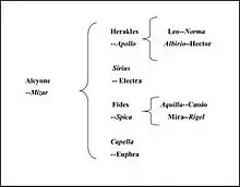 - «Алкион женился на Мицар, и у них было четверо детей — два сына, Геракл и Фидес, и две дочери, Сириус и Капелла...»[20].