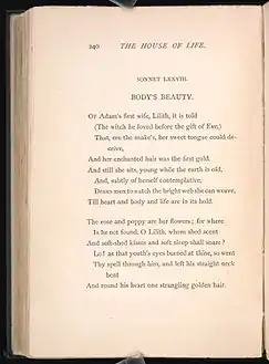 На раме картины начертан сонет авторства самого Россетти Красота души[16], на раме «Леди Лилит» же написан другой сонет. Пары картин и сонетов были впервые опубликованы вместе Алджерноном Чарльзом Суинбёрном в 1868 году. В 1870 стихотворения были опубликованы в сборнике Россетти «Сонеты для картин». В 1881 году Россетти переименовал сонет «Лилит» в «Красоту тела» и опубликовал два сонета рядом в книге «Дом жизни» тем самым напрямую объединив пару контрастных произведений[16][17].