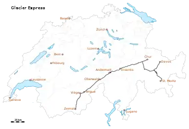 Ледниковый экспресс — поезд, соединяющий железнодорожные вокзалы двух крупных горных курортов : Санкт-Морица и Церматта в швейцарских Альпах. Поезд эксплуатируется совместно Железной дорогой Маттерхорн-Готтард(MGB) и Ретийской железной дорогой (RhB). Значительную часть своего пути, он проходит через объект Всемирного наследия ЮНЕСКО, Ретийская железная дорога в культурном ландшафте Альбулы и Бернины.