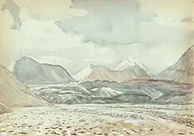 ![]() Максимильян Пресняков. Вид на ледник Семёнова, долина реки Сарыджаз (акварель, 2015) | |