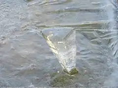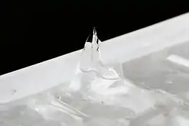 Естественно сформированные ледяные шипы, часто в формах свечей или многогранных башен (обычно треугольных), иногда появляются в контейнерах с замерзшей дождевой водой или водой из-под крана.[8] Вода расширяется на 9 % при замерзании, и самая простая форма кристалла льда, которая отражает свою внутреннюю структуру — это шестиугольная призма. Верхняя и нижняя поверхности кристалла — шестиугольные плоскости называются основными плоскостями. Направление, перпендикулярное основным плоскостям, называется c-осью.[9]