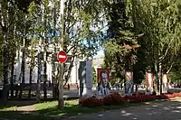 | Мозаичные портреты работы Нади Леже в сквере напротив ДК «Мир». Слева направо на фото: Фернан Леже, Максим Горький, Зоя Космодемьянская, Пётр Чайковский, Родион Щедрин. | Мозаичные портреты работы Нади Леже в сквере напротив ДК «Мир». Слева направо на фото: Майя Плисецкая, Дмитрий Шостакович, Владимир Маяковский, Леонид Коган, Лев Толстой. | Мозаичные портреты работы Нади Леже в сквере перед ДК «Октябрь». Слева направо на фото: Юрий Гагарин, Владимир Комаров, Георгий Добровольский, Владислав Волков. |