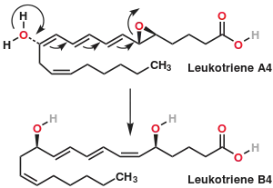 Действие лейкотриена B4 на нейтрофилы особенно важно. Он активирует их трансмиграцию, блокирует клеточный апоптоз и индуцирует высвобождение секреторных гранул нейтрофилов, что связано с образованием реактивных форм кислорода.[1] Наконец, лейкотриен Б4 усиливает фагоцитоз макрофагов и вызывает высвобождение ими провоспалительных цитокинов.
