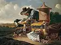 Натюрморт в пейзаже c приспособлениями для охоты, охотником и собакой. Ок. 1670. Холст, масло 124 × 169 см. (Продан на аукционе Сотбис, Лондон, 1 ноября 2001)