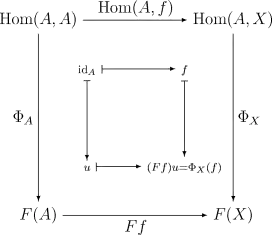 Доказательство леммы Йонеды представлено на следующей коммутативной диаграмме: