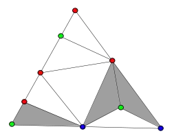 Легко проверить, что возможные степени вершин, соответствующих треугольникам, это 0, 1 или 2, и 1 соответствует треугольнику, вершины которого покрашены во все три цвета.