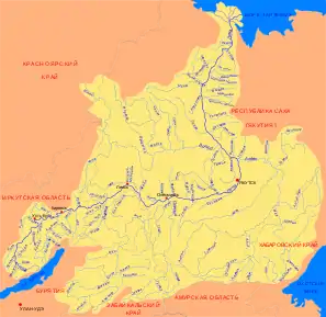 Протекает по территории Иркутской области и Якутии, некоторые из её притоков относятся к Забайкальскому, Красноярскому, Хабаровскому краям, Бурятии и Амурской области. Лена — самая крупная из российских рек, чей бассейн целиком лежит в пределах страны[11]. Также это крупнейшая река в мире, полностью протекающая в районе вечной мерзлоты.
