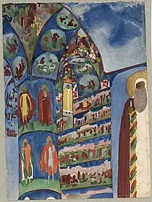 В отдельных случаях наблюдается влияние древнерусской живописи[59]. Тырса и Ведерников изучали и копировали древнерусскую фреску. В 1910—1917 годах Тырса принимал участие в поновлении росписей церкви Святого Василия на Овруче, вместе с Н. Рерихом расписывал Спасскую церковь в Талашкине[60]. Лапшин в 1911—1912 годах слушал лекции по истории древнерусского искусства, которые читал Н. Покровский в петербургском Археологическом институте[58].