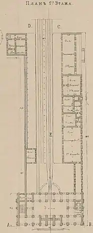 Архитектор Тон планировал расположить симметрично относительно главного здания вокзала два флигеля для таможни и квартир служащих, но реализовали только первый из них. Строительство комплекса завершилось к 1853 году, он состоял из трёхэтажного главного корпуса, одноэтажного пакгауза и двухэтажного крыла с квартирами служащих[26][7].