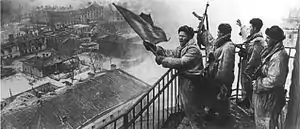 ![]() Советские солдаты П.Мимин, А.Фомин, С.Тушканов и А.Базаров водружают красный флаг над освобождённым от немецко-фашистских захватчиков городом Гатчина, 26 января 1944 года. Фотография В.С. Тарасевича[2]. | |||