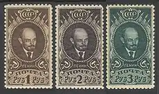 В 1925 году, в день годовщины со дня смерти Ленина, был сделан второй выпуск советских ленинских марок с изображением деревянного Мавзолея работы художника В. Завьялова (ЦФА [АО «Марка»] № 212—219)[21]. Большой популярностью пользовались крупновалютные марки достоинством в 1, 2, 3, 5 и 10 рублей с портретом В. И. Ленина[22], печатавшиеся в 1925—1928 годах.