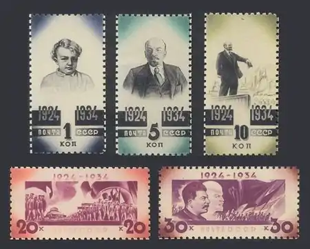 К 10-летию (1934) и 20-летию (1944) со дня смерти В. И. Ленина появились две серии (ЦФА [АО «Марка»] № 475—480 и 908—914), рисунки которых практически повторялись, воспроизводя портреты Ленина в детские, юношеские и зрелые годы (причём на одном сюжете Ленин был изображён вместе со Сталиным). Различия между сериями заключались в памятных датах («1924—1934» и «1924—1944») и номиналах (серия 1934 года — 1, 3, 5, 10, 20 и 30 копеек; серия 1944 года — 30, 30, 45, 50, 60 копеек, 1 и 3 рубля)[2].