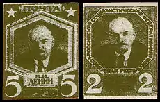 Сам Ленин при жизни был против попыток помещения его портретов на почтовые марки. Когда Ленин узнал в 1921 году о подготовке советским почтовым ведомством первой марки с его изображением, он категорически запретил её выпуск, заявив[3][4][5]: