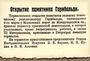- Памятник Д. Гарибальди, скульптор К. Зале[30] (1919, Международный проспект);