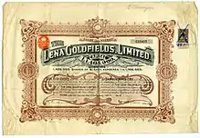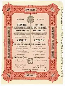 Ленские акции начали котироваться на Петербургской бирже в 1905 году, когда «Ленское товарищество» было уже прибыльным предприятием, но ещё не давало дивиденда. Акции, номиналом 750 рублей, на бирже расценивались в среднем в 225 рублей. До 1908 года биржевая цена акций ни разу не поднялись выше номинала[4]. С переходом собственности «Лензото» в руки «Lena Goldfields» акции компании начали стремительно расти. В 1909 году они поднялись до 1850 рублей. В 1910 году «Ленское товарищество» выдавало акционерам 56% дивиденда и котировки акций поднялись до колоссальной цифры в 6075 рублей. Небывалый подъём ленских акций был достигнут при помощи целой системы биржевых махинаций управляемых группами акционеров и различными биржевыми маклерами. Использовался весь известный на то время арсенал средств: подкупная бульварная и «солидная» печать, биржевые маклеры, сомнительные банки и т. д. 30 декабря 1910 года акция упала до 3100 рублей, затем опять была поднята до 5500 рублей[4] и такие скачки котировок происходили непрерывно.