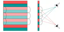 На рисунке изображён простейший пример сепарации изображений красного и зелёного квадратов. Каждое из них разделяется на ряд узких полос, параллельных растру, а затем полосы чередуются. Сквозь лентикуляр зелёные полосы видимы только под наклоном взгляда сверху вниз, а красные — только снизу вверх. Из каждого положения видно только одно частичное изображение, сливающееся в целое за счёт поперечного увеличения растра. С верхней точки обзора видимо только зелёное, а с нижней — только красное изображения. Таким же способом на оборотной стороне растра может быть отпечатано несколько изображений, каждое из которых видимо только с определённого угла обзора[4]. При количестве изображений, достигающем 30, на отпечатке может быть зафиксирован короткий видеоролик, длительностью до 1 секунды. Он воспроизводится поворотом отпечатка вокруг оси, параллельной растру. При вертикальном расположении растра возможна запись одной или более стереопар, поскольку правый и левый глаза видят через такой растр разные изображения. Более того, при наклоне отпечатка вокруг вертикальной оси, глаза могут рассматривать несколько разных стереопар, снятых под разными углами. Таким образом реализуется многоракурсное изображение, позволяющее рассмотреть объект с разных сторон и даже «заглянуть» за него[5].