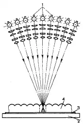 Проецирование негативных изображений ракурсов через растр на светочувствительный материал. Группа независимых проекторов направлена на одну и ту же доску увеличителя, так что их оптические оси сходятся в одной точке. В каждом проекторе установлен один негатив или слайд из комплекта ракурсов объекта.
