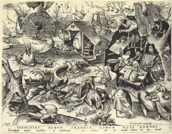 Рисунок пером, по которому различные мастера создавали гравюры, был создан Брейгелем в 1557 году. В 1558 году издатель Иероним Кок начал печатать гравюры по этому рисунку Брейгеля.