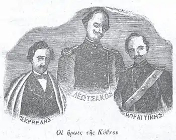 Захватив в порту острова пароходы «Оттон» и «Картериа», революционеры отправились на близлежащий остров Тинос. Встретив сопротивление на Тиносе, революционеры на пароходе «Картериа» отправились на остров Китнос, освобождать арестованных 1 февраля в Афинах полицией Оттона и сосланных на Китнос. При выходе из Китноса «Картериа», с революционерами и освобождёнными на борту, встретилась с «Амалия (паровой фрегат)», с ротой правительственных войск на борту. «Картериа» вернулась в гавань. На берегу вокруг Леотсакоса, Морайтиниса и освобождённого 19-летнего младшего лейтенанта Скарвелиса осталось только 18—20 человек. Леотсакос и его соратники отказались сдаваться. В последовавшем бою Леотсакос, Морайтинис и Скарвелис погибли[6][7].