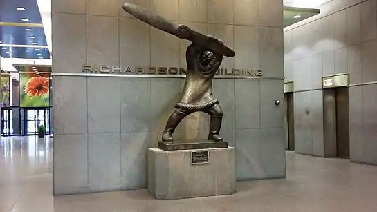 | «Лесорубы», Парк скульптур Лео Мола | Статуя авиатора в фойе Ричардсон-билдинг | «Дерево детей» у входа в здание |