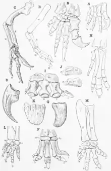 Таз в целом маленький, уплощённый, но длинный; седалищная кость удлинена, слегка искривлённая[7]. Прочный массивный вал подвздошной кости, напоминающий изогнутый лук. Вертлужная впадина перфорирует её почти посередине[38].
