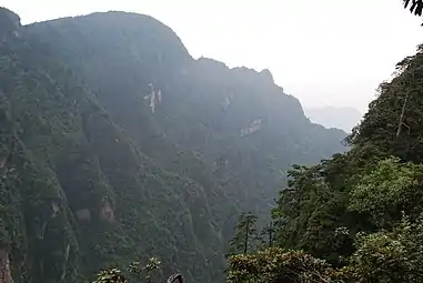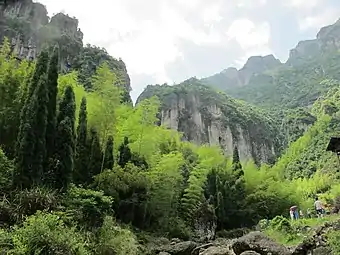 В смешанных лесах у тсуги китайской появляются новые соседи: кипарисовик тупой, куннингамия и тайвания; усиливаются позиции тиса, рододендрона и бамбука (в подлеске)[35][36]. В буковых лесах среднегорий ощутимо присутствие вечнозелёных деревьев (до 25 %). На месте буковых возникают вторичные леса, сформированные листопадными дубами (Quercus serrata…), с участием каштана Генри и калопанакса. Под их кронами, помимо прочих деревьев, растут мелиосма, стюартия и стиракс. В подлеске распространены гортензия, линдера, калина и небольшой бамбук, например Fargesia, а в травяном покрове встречается хоста[32][33]. В долинах горных рек удерживаются ореховые, тетрадиум Даниэля и различные клёны, тогда как альтернативные сообщества включают тетрацентрон, церцидифиллюм, давидию, конский каштан и магнолию (Yulania). Скалы покрыты сосной тайваньской с подлеском из рододендрона, элеутерококка и абелии[37].