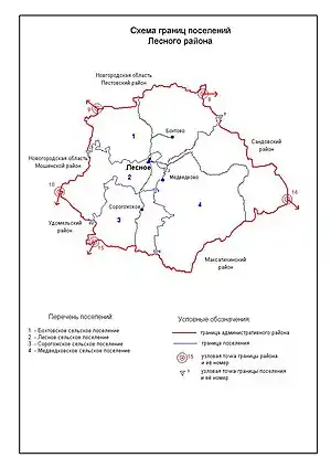 В Лесной район, с точки зрения административно-территориального устройства области, входили 4 поселения[27][28].