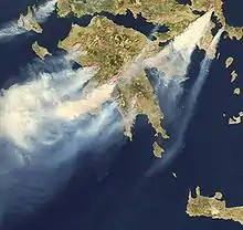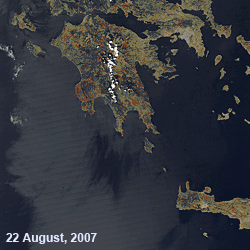 Греция, особенно южная, отличается тёплым, сухим климатом (см. средиземноморский климат), малым количеством осадков осенью и летом. Здесь мало осадков, а речки коротки, малочисленны и маловодные, большинство пересыхает летом. Лето 2007 отличалось особой засушливостью, три антициклона с температурами, достигающими 40 °C, успели пройти над Грецией за период с июня по сентябрь, а жертвами эпизодических пожаров к августу стали 9 человек.