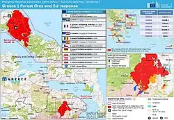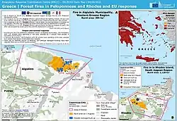 Самые крупные лесные пожары происходят в Аттике, Олимпии, Месинии, а самые разрушительные — на севере Эвбеи.[6][7][8][9] С островов паромы эвакуировали около 2000 человек[5]. К настоящему времени сгорело 125 000 гектаров пахотных земель (худший пожарный сезон с 2007 года), только на севере Эвбеи сгорело более 50 000 гектаров[5][10]. Всемирная метеорологическая организация связала пожары с региональной волной тепла и сезоном лесных пожаров, усугубляемым изменением климата[11][12].