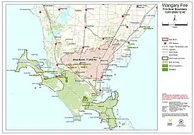 ![]() Граница очага пожара по состоянию на 13 января 2005 г. (розовая зона: огонь распространился на 40 км к востоку от точки возгорания) | |