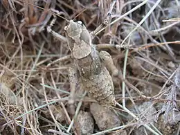 Надкрылья самца немного, у самки почти вдвое короче переднеспинки. Церки самца сильно загнуты внутрь, с сильно оттянутой заостренной вершиной. Яйцеклад немного короче заднего бедра. Надкрылья самца 3,5—4 мм, самки 2—6 мм. Яйцеклад 22—23 мм.[2]