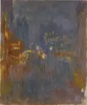 | Лестер-сквер, Лондон, ночью, фр. Leicester Square, Londres, la nuit. 80,5 × 64,8 см. Фонд Жана и Сюзанны Планк, Швейцария. Инв. № FJSP-998-116[2]. | К моменту смерти Клода Моне картина оставалась в его мастерской и была унаследована его сыном Мишелем Моне[3]. Впоследствии находилась в коллекции Жана Планка из Швейцарии. После смерти Планка в 1998 году картина перешла в собственность ранее основанного им и его женой Сюзанной художественного фонда. |