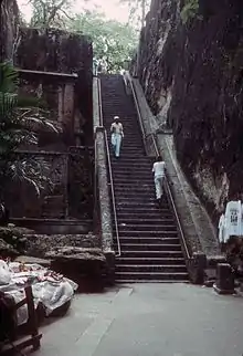 В буддизме лестница Шакьямуни изображается со следом Будды на нижней и верхней ступеньках. Шакьямуни сходит с неба Тушита на землю по лестнице, принесённой ему Индрой.