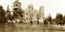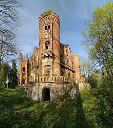 Трёхэтажная пристройка конца XIX века составляет по размеру почти половину старого дома. Единство комплексу придают 6-гранные башенки по углам достройки с такими же зубцами, что и на старой части дворца, но сплошной кладки. Зубцы сделаны по всему периметру достройки, в стенах вмонтированы декоративные вазы и другие детали. Основное отличие — квадратные формы и водяное (батарейное) отопление. Для подачи воды в бак (3-й этаж) пробили скважину, сделали выход на прогулочную площадку размером 15 на 20 метров, огороженную зубцами (крыша 3-го этажа).