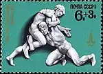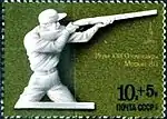 - Почтово-благотоворительный выпуск Игры XXII Олимпиады. Москва-80. На марке (ЦФА [АО «Марка»] № 5048) — толкание ядра, многоцветная. Офсетная печать, перфорирована: комбинированная гребенчатая зубцовка 12½:12 (на каждые 2 сантиметра края марки приходится 12½:12 зубцов). В марочных листах 36 (6×6) и малые листы (кляйнбогены) по 20 (4×5) марок[8][36][37].