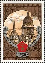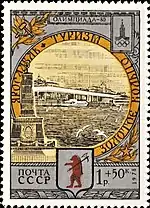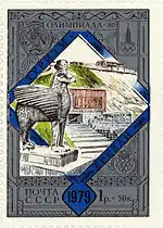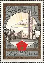 - Почтово-благотоворительный выпуск «Туризм под знаком Олимпиады в СССР». На марке (ЦФА [АО «Марка»] № 5054) — Ленинград. Монумент героическим защитникам Ленинграда, многоцветная. Глубокая печать в сочетании с металлографией, перфорирована: комбинированная рамочная зубцовка 12:11½ (на каждые 2 сантиметра края марки приходится 12:11½ зубцов). В марочных листах 25 (5×5) и малые листы (кляйнбогены) по 16 (4×4) марок[8][40][39].