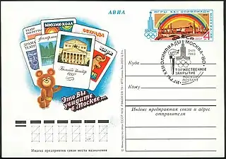 - Номерной почтовый блок 90×70 мм «Успешное завершение Игр XXII Олимпиады в Москве», художественное оформление полей: эмблема Олимпиады на фоне московских зданий, маршрут факельной эстафеты Олимпийского огня, памятный текст: «Советские спортсмены на Играх XXII Олимпиады завоевали: 80 золотых, 69 серебряных и 46 бронзовых медалей». На многоцветной марке олимпийский медвежонок Мишка с факелом — талисман Игр. (ЦФА [АО «Марка»] № 5126А) — без номера с надпечаткой «ПОГАШЕНО». Офсетная печать, перфорирована: рамочная зубцовка 12:12½ (на каждые 2 сантиметра края марки приходится 12:12½ зубцов)[8][41][42].