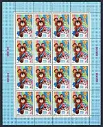 - Новогодняя марка (ЦФА [АО «Марка»] № 5016) — Олимпийский Мишка, многоцветная. Офсетная печатьна мелованной бумаге с лаковым покрытием, перфорирована: комбинированная рамочная зубцовка 12:12½ (на каждые 2 сантиметра края марки приходится 12:12½ зубцов). Разновидность (ЦФА [АО «Марка»] № 5016А) — без зубцов. В марочных листах 36 (6×6) и малые листы (кляйнбогены) по 16 (4×4) марок[7][32][35].