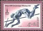 - Почтово-благотоворительный выпуск Игры XXII Олимпиады. Москва-80. На марке (ЦФА [АО «Марка»] № 5044) — прыжки с шестом, многоцветная. Офсетная печать, перфорирована: комбинированная гребенчатая зубцовка 12½:12 (на каждые 2 сантиметра края марки приходится 12½:12 зубцов). В марочных листах 36 (6×6) и малые листы (кляйнбогены) по 20 (4×5) марок[8][36][37].