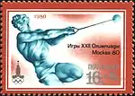- Почтово-благотоворительный выпуск Игры XXII Олимпиады. Москва-80. На марке (ЦФА [АО «Марка»] № 5047) — метание молота, многоцветная. Офсетная печать, перфорирована: комбинированная гребенчатая зубцовка 12½:12 (на каждые 2 сантиметра края марки приходится 12½:12 зубцов). В марочных листах 36 (6×6) и малые листы (кляйнбогены) по 20 (4×5) марок[8][36][37].