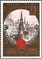 - Почтово-благотоворительный выпуск «Туризм под знаком Олимпиады в СССР». На марке (ЦФА [АО «Марка»] № 5051) — Москва. Кремль «Водовзводная башня Кремля», многоцветная. Глубокая печать в сочетании с металлографией, перфорирована: комбинированная рамочная зубцовка 12:11½ (на каждые 2 сантиметра края марки приходится 12:11½ зубцов). В марочных листах 25 (5×5) и малые листы (кляйнбогены) по 16 (4×4) марок[8][36][39].