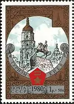- Почтово-благотоворительный выпуск «Туризм под знаком Олимпиады в СССР». На марке (ЦФА [АО «Марка»] № 5055) — Киев. Памятник Богдану Хмельницкому, многоцветная. Глубокая печать в сочетании с металлографией, перфорирована: комбинированная рамочная зубцовка 12:11½ (на каждые 2 сантиметра края марки приходится 12:11½ зубцов). В марочных листах 25 (5×5) и малые листы (кляйнбогены) по 16 (4×4) марок[8][41][39].
